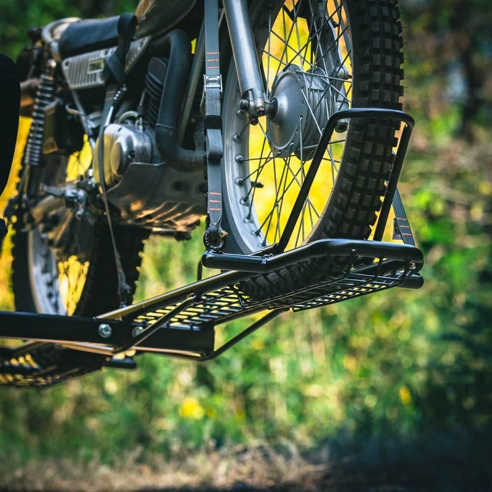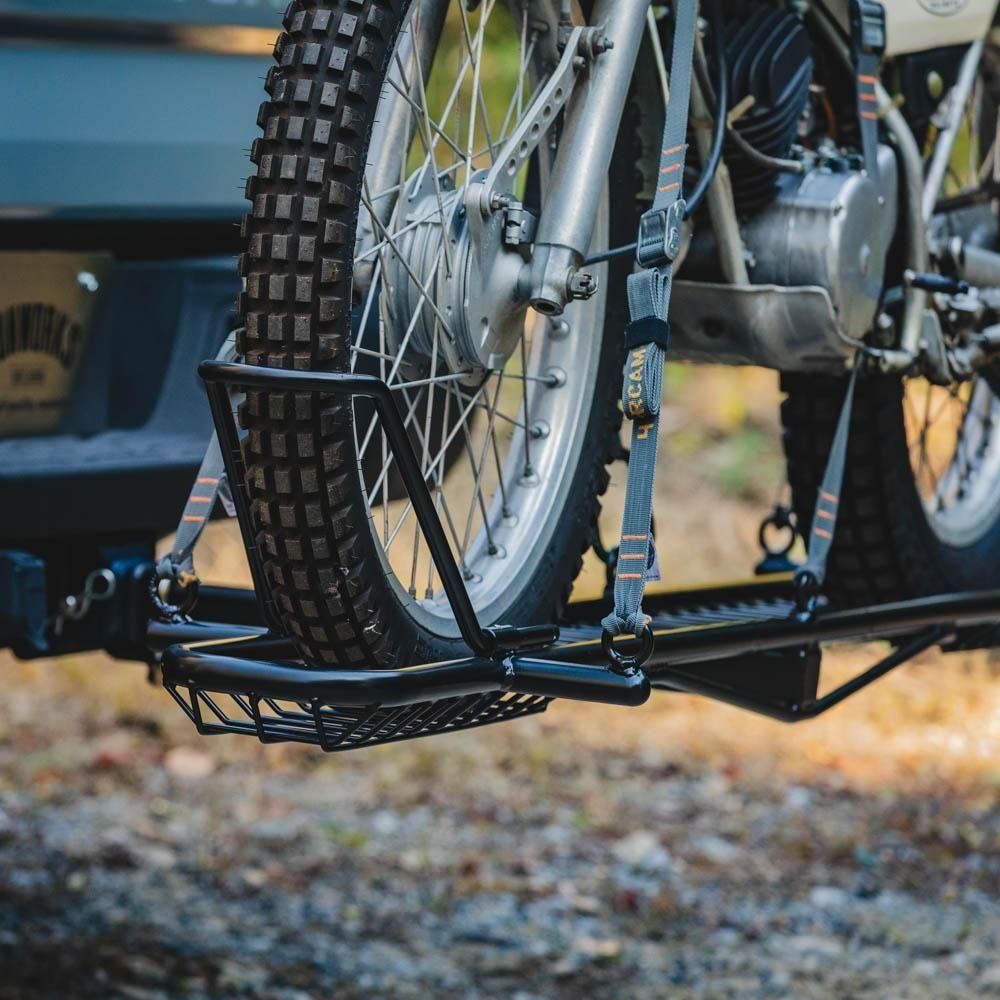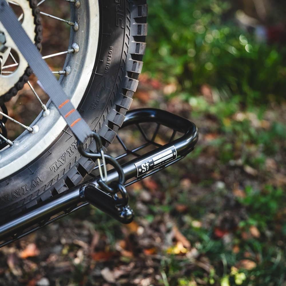 車両のヒッチメンバーに取り付けるだけで簡単に着脱が可能なS+のモーターサイクルキャリア。タイヤサイズにあわせて前後に調整が可能なタイヤホルダーと6点のアイボルトによりバイクを固定することで山道や林道などの悪路においても安全に運搬でき、林道ツーリングやオフロードなどバイクを存分楽しめる環境へ愛車を連れ出すことができます。
